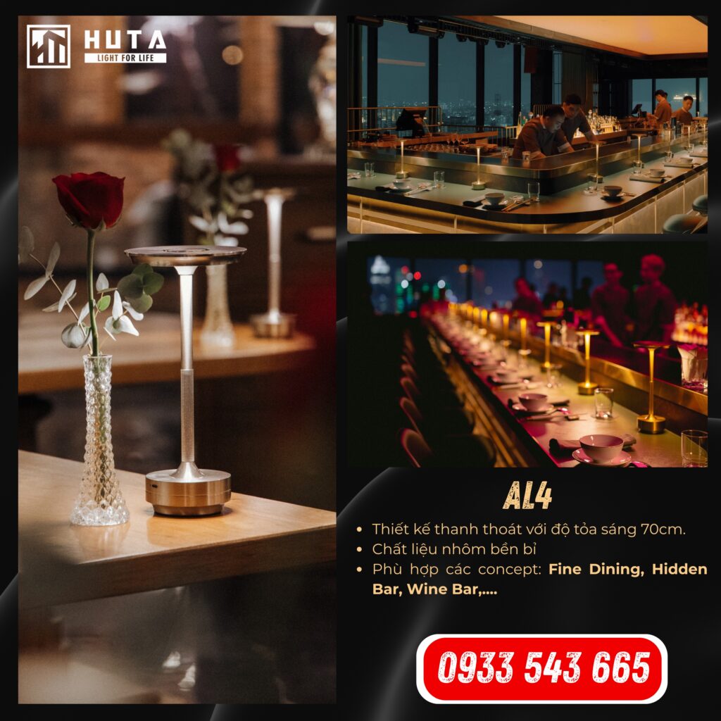 Với hơn 100 mẫu đèn bàn pin sạc cao cấp, HUTA Light For Life mang đến đầy đủ các sự lựa chọn về kiểu dáng, chất liệu, độ sáng — đa dạng cho mọi phong cách không gian quán bar như hidden, rooftop,...