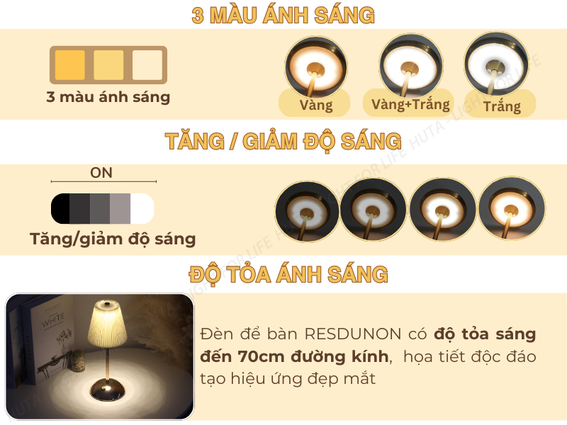 - Tiếp tục chạm để thay đổi 3 màu ánh sáng là vàng – trắng – trung tính