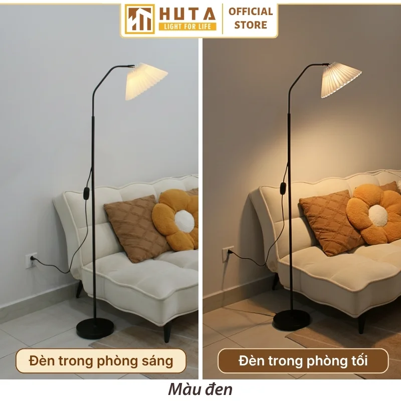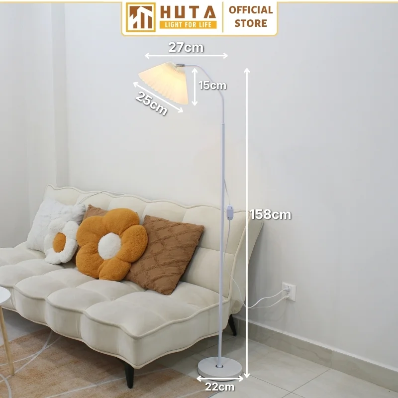 Đèn cây đứng HUTA Light For Life thân kim loại dáng cong mã KT6 với chao xếp ly vải được ép nhựa chắc chắn, thân và đế kim loại chắc chắn và ánh sáng vàng ấm áp sẽ giúp không gian trở nên hài hòa.
