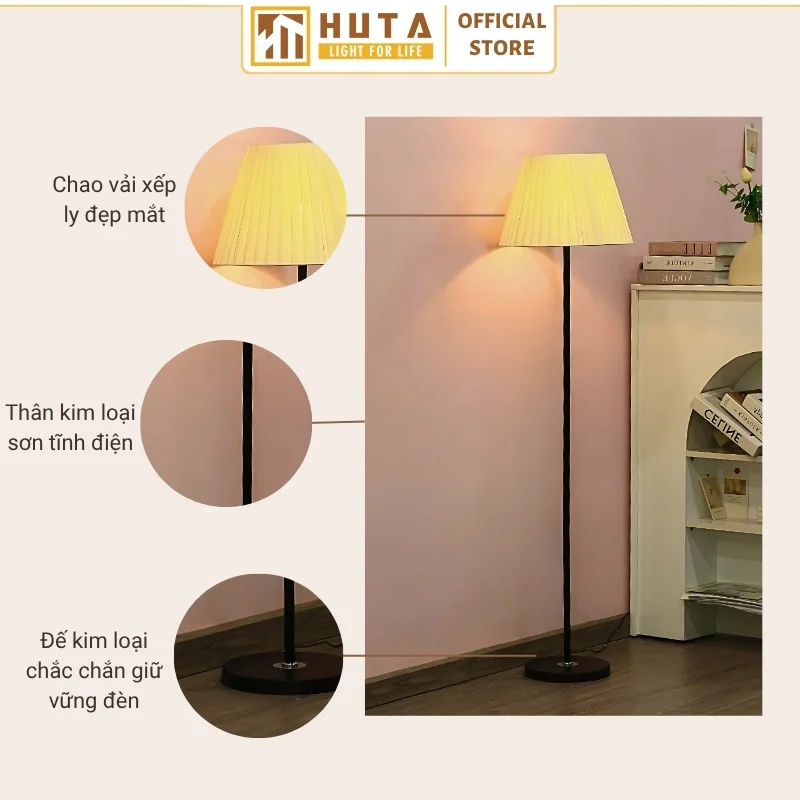 Đèn cây đứng HUTA Light For Life thân kim loại dáng thẳng mã KT1 với chao vải xếp ly chắc chắn, thân kim loại cùng đế kim loại bản to chắc chắn và ánh sáng vàng ấm áp sẽ giúp không gian trở nên hài hòa.