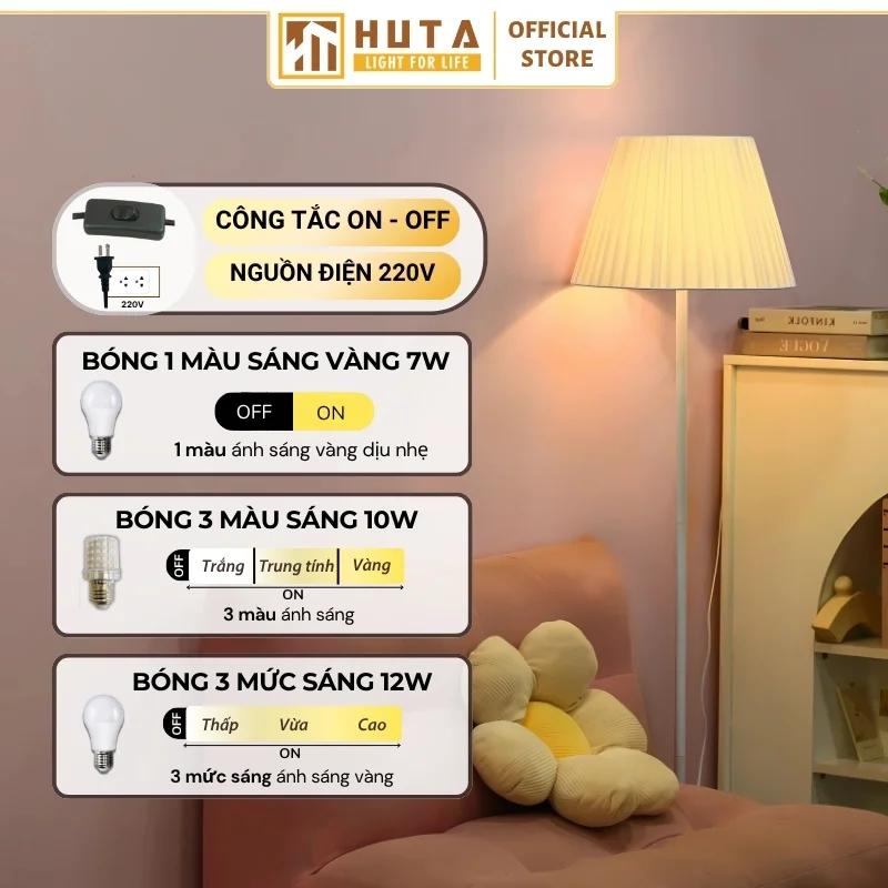 Đèn cây đứng HUTA Light For Life thân kim loại dáng thẳng mã KT1 nổi bật với thiết kế thân kim loại dáng thẳng kết hợp chao vải xếp ly cao cấp, mang lại cảm giác chắc chắn nhưng vẫn tinh tế. Ánh sáng vàng ấm áp không chỉ giúp không gian trở nên dễ chịu hơn mà còn tạo điểm nhấn và chiều sâu rõ rệt trong tổng thể.