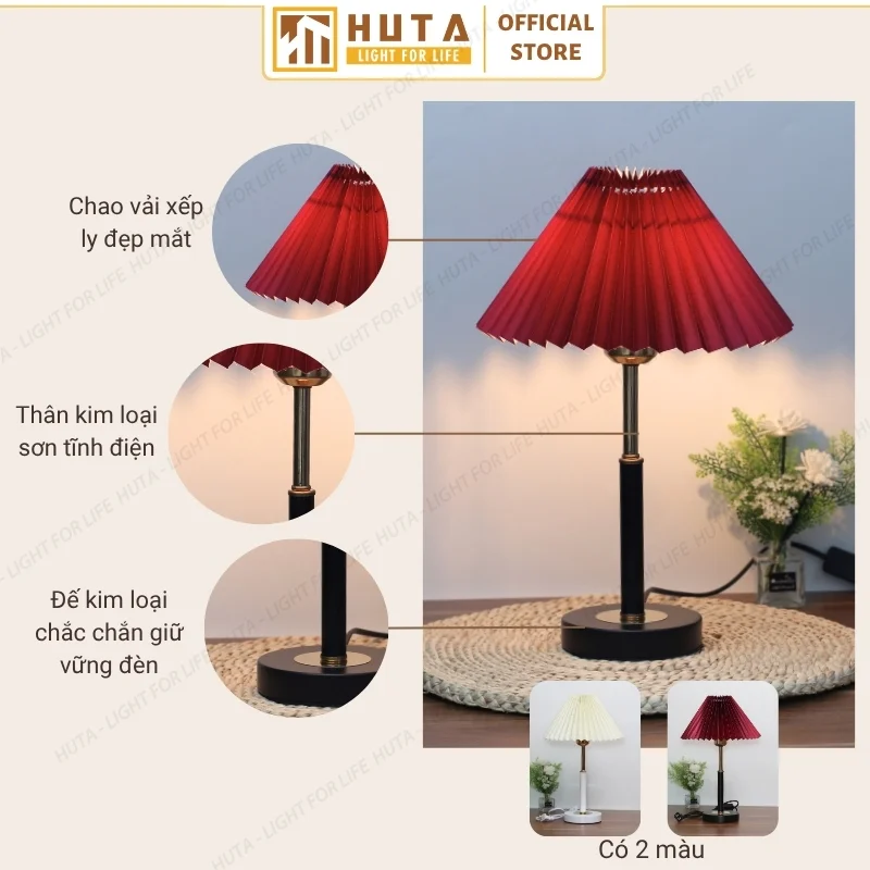 Đèn ngủ để bàn decor khách sạn, homestay thân kim loại mã T9 mang phong cách thiết kế sang trọng với phần thân làm từ kim loại bền bỉ kết hợp cùng chao đèn xếp ly bền đẹp. Mẫu đèn bàn thân kim loại T9 phù hợp với diện tích căn phòng 15m2. Ngoài ra mẫu đèn bàn thân kim loại T9 có 2 màu thân đen – chao đỏ và thân trắng – chao kem phù hợp với từng không gian khách sạn, homestay, căn hộ khác nhau
