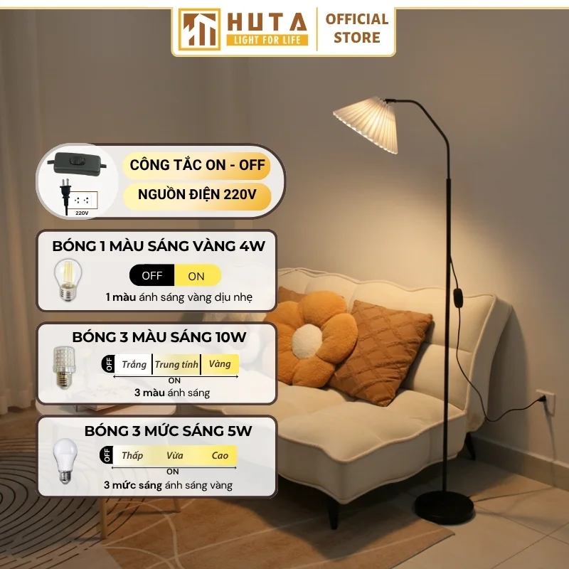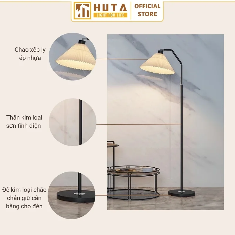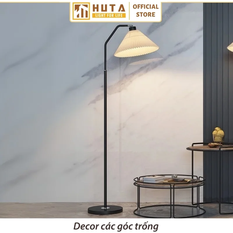 Đèn cây đứng HUTA Light For Life thân kim loại dáng cong mã KT6 với chao xếp ly vải được ép nhựa chắc chắn, thân và đế kim loại chắc chắn và ánh sáng vàng ấm áp sẽ giúp không gian trở nên hài hòa.
