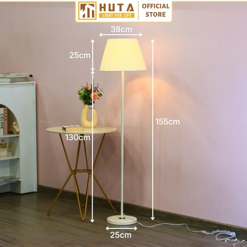 Đèn cây đứng HUTA Light For Life thân kim loại dáng thẳng mã KT1 với chao vải xếp ly chắc chắn, thân kim loại cùng đế kim loại bản to chắc chắn và ánh sáng vàng ấm áp sẽ giúp không gian trở nên hài hòa.